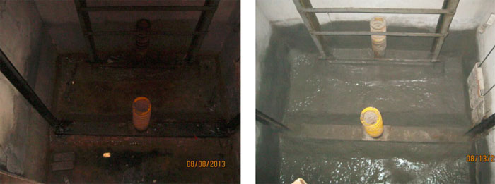 根据现场条件,为降低对周边环境的影响,缩短工期,降低施工成本,保证无渗漏整体效果,决定采用郑州赛诺建材的专业内防水技术,特种材料,设计结构补强加固、抗渗堵漏的处理方案,即不进行外部的开挖,从室内施工,采用YYA防水抗渗、YY16闪凝堵漏补强、YY17止水抗渗、YYR伸缩缝专用密封堵漏、YY36防水抗裂密封等特种耐候抗渗材料施工,构建一个高强度的多重防水抗渗系统,彻底解决渗漏水的问题。